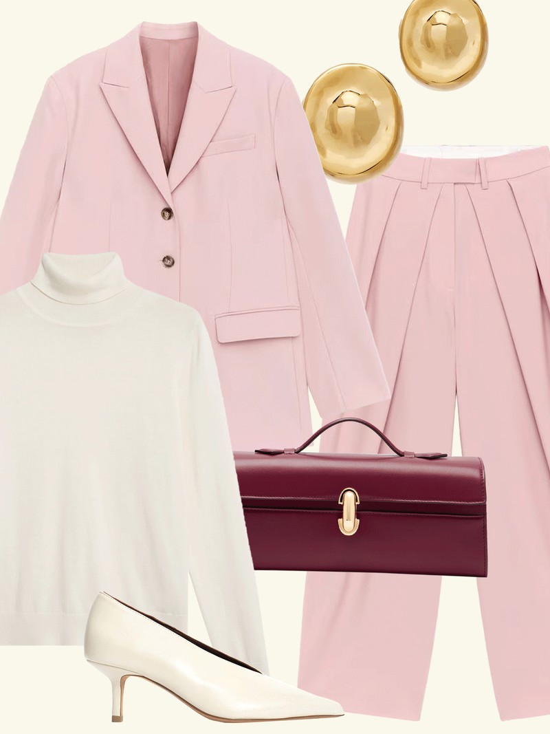 A co-ord is a no-brainer. A roll-neck layered underneath adds warmth without bulk, while white heels feel fresh. A deep red clutch introduces an unexpected – and flattering – colour contrast.