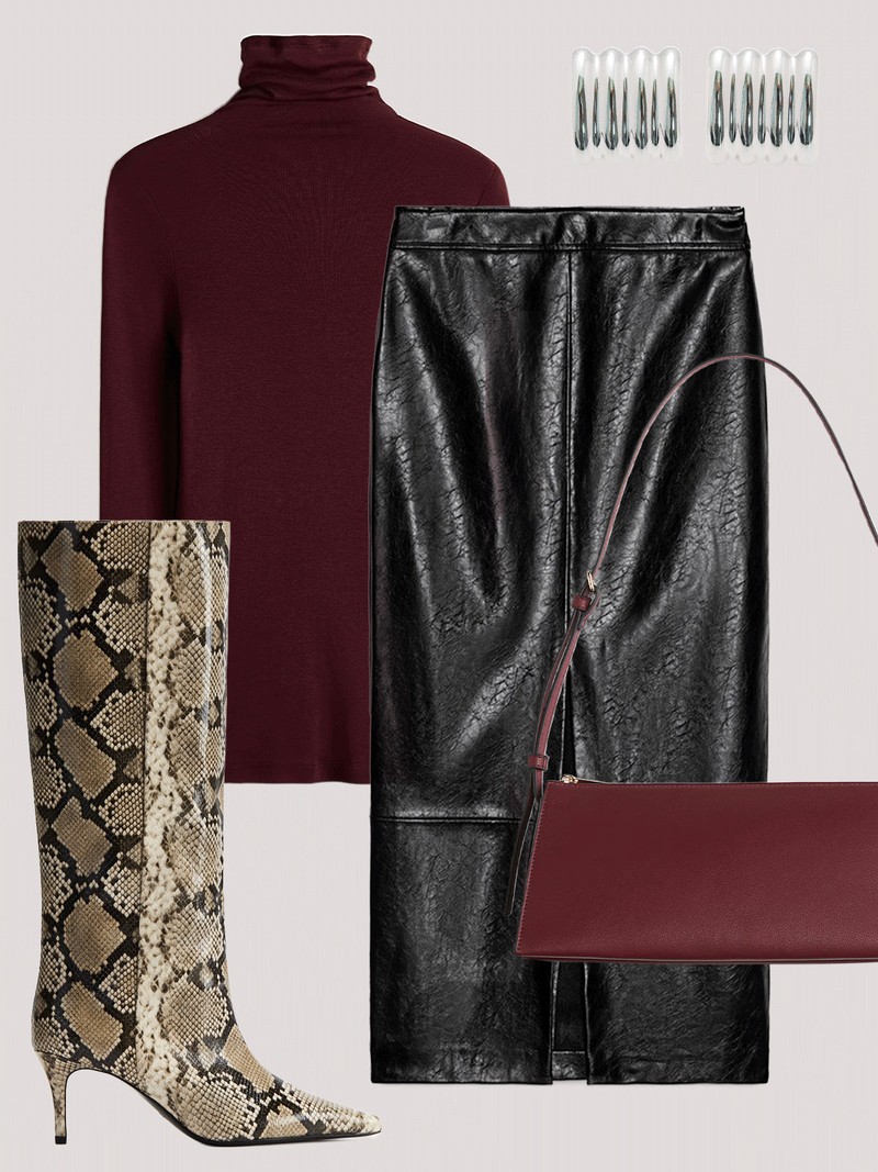 A faux leather midi skirt paired with a burgundy slimline roll neck sets the tone, while statement snakeskin boots bring the edge. Finish with silver jewellery and a matching burgundy bag for a polished twist.