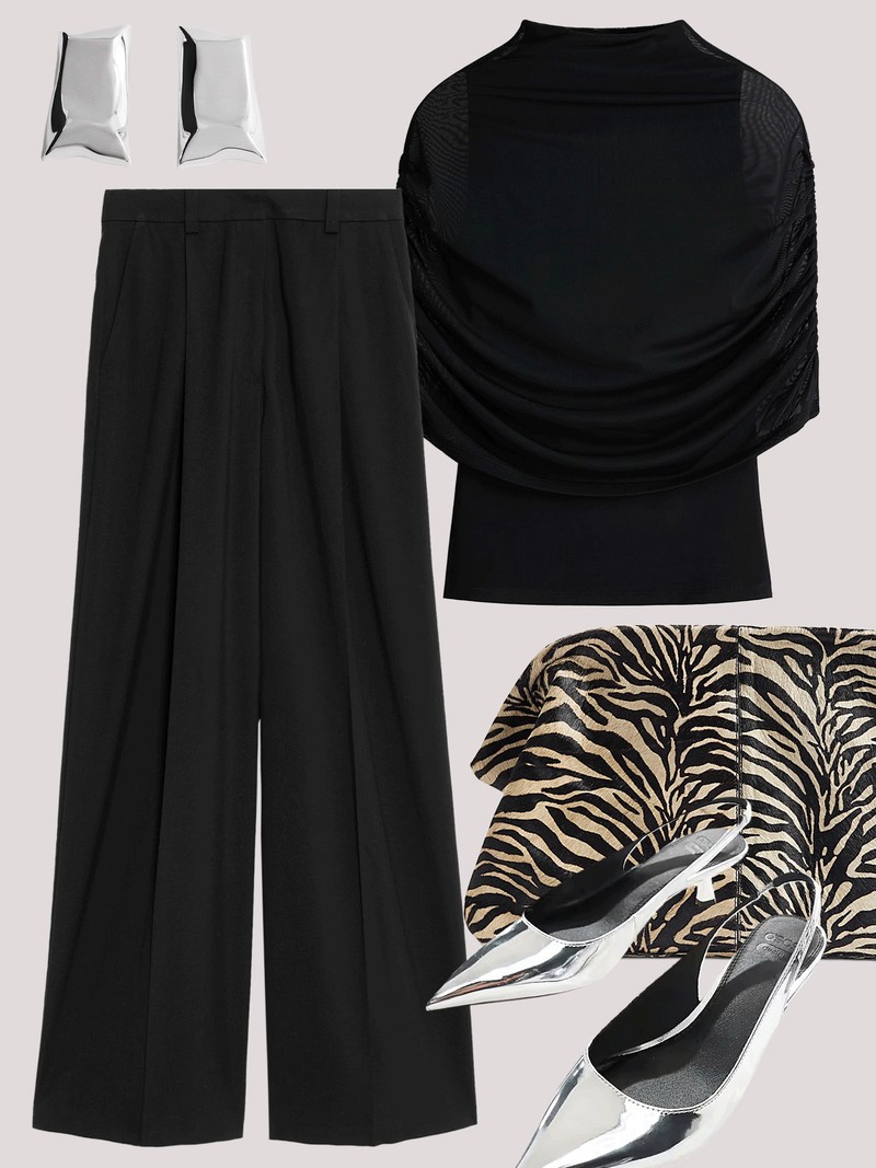 You can’t beat all-black after dark. Elevate the classic combo with oversized earrings and a zebra-print clutch for immediate cool-girl impact.