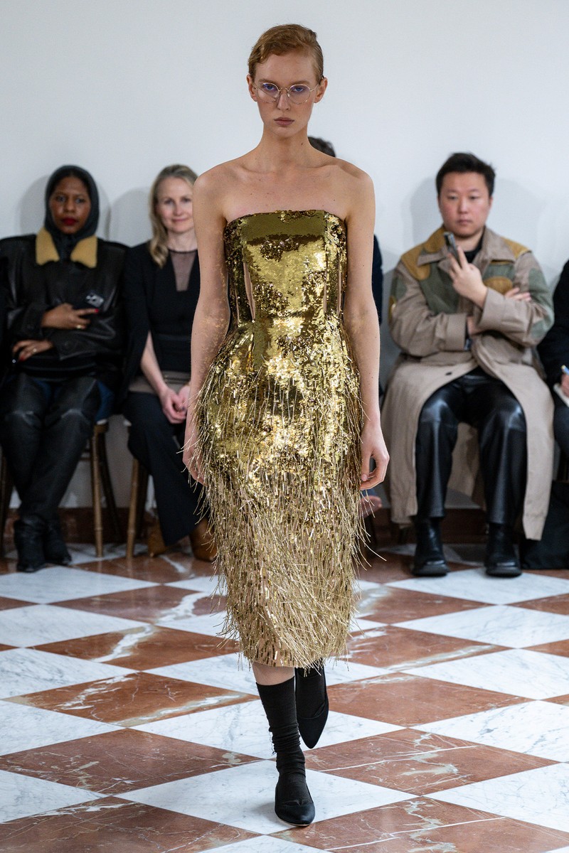 Unsurprisingly, drama took centre stage at Harris Reed, where high-impact silhouettes and high-shine finishes delivered a sense of theatrical glamour. The tailoring was softened with more fluid draping, while metallic accents and sweeping proportions added impact. Bold yet elegant, the overall mood felt cool and expressive.