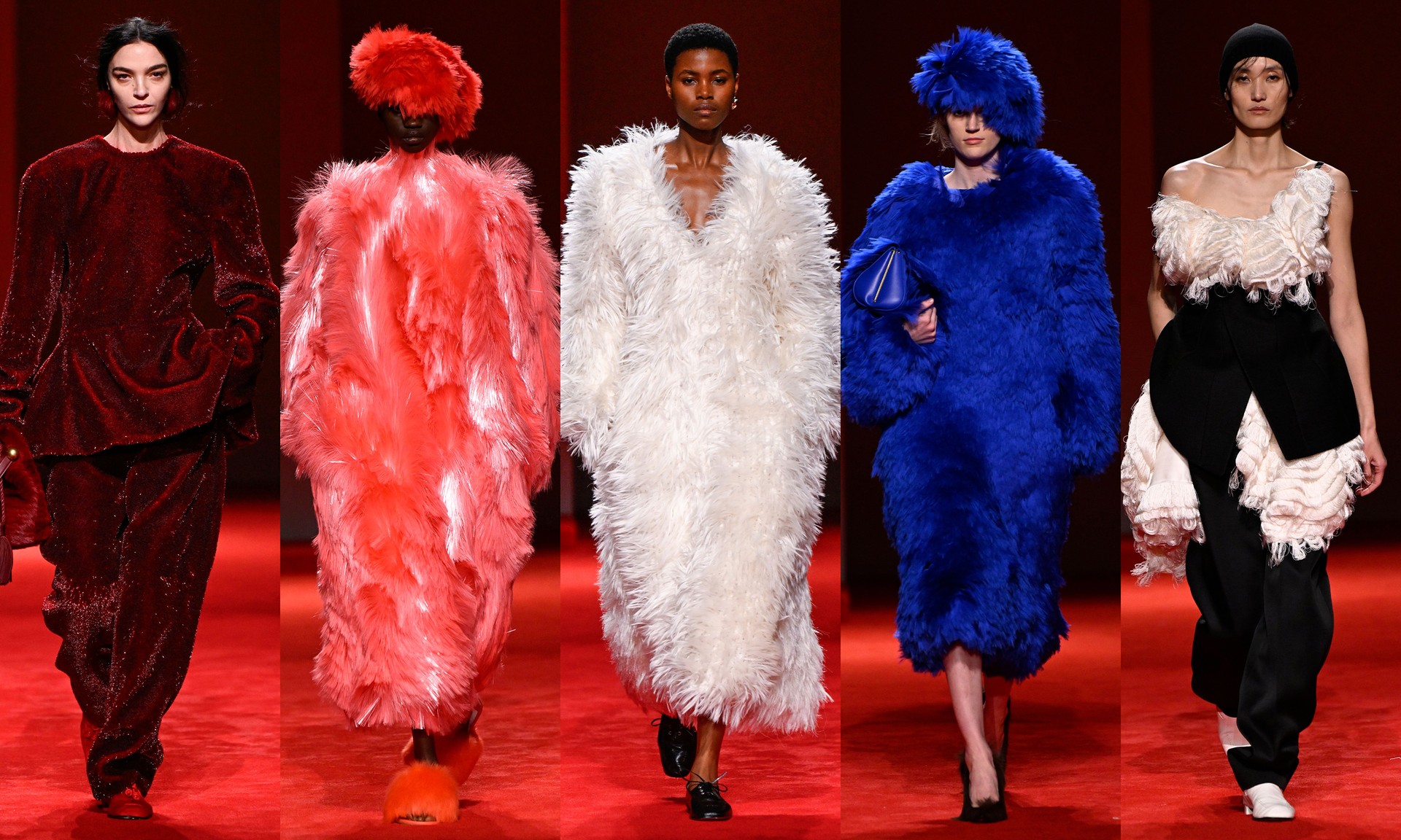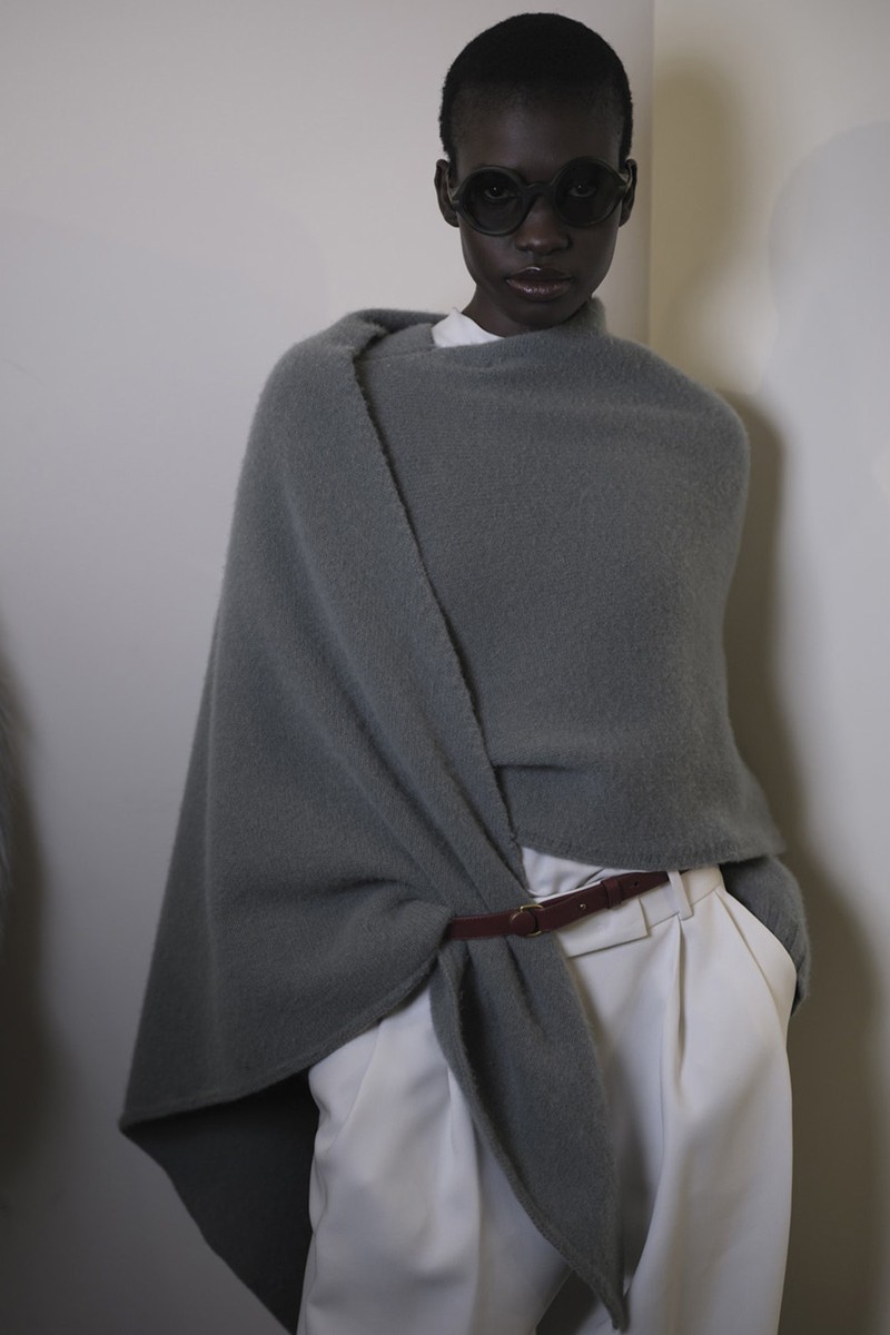 Louise Trotter doubled down on sculptural outerwear, buttery leather and rich textures this season with a selection of oversized fringed coats, strong shoulders and pieces designed to cocoon the body. Standout pieces included a punchy red co-ord and the oversized fringe jackets in optic white and scarlet.