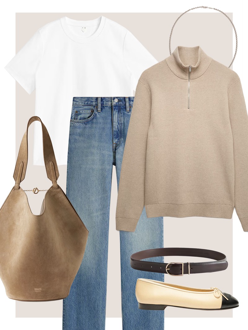 Take cues from the Chanel runway by layering a quarter-zip over a white tee, and teaming it with straight-leg denim, pumps and a suede bag.