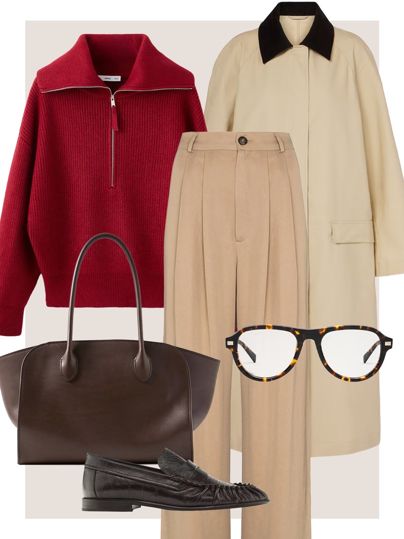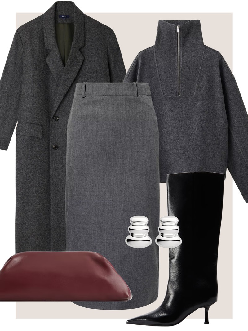 A quarter-zip isn’t just casual – with a wool pencil skirt, patent black boots and a statement clutch, it feels evening-appropriate.
