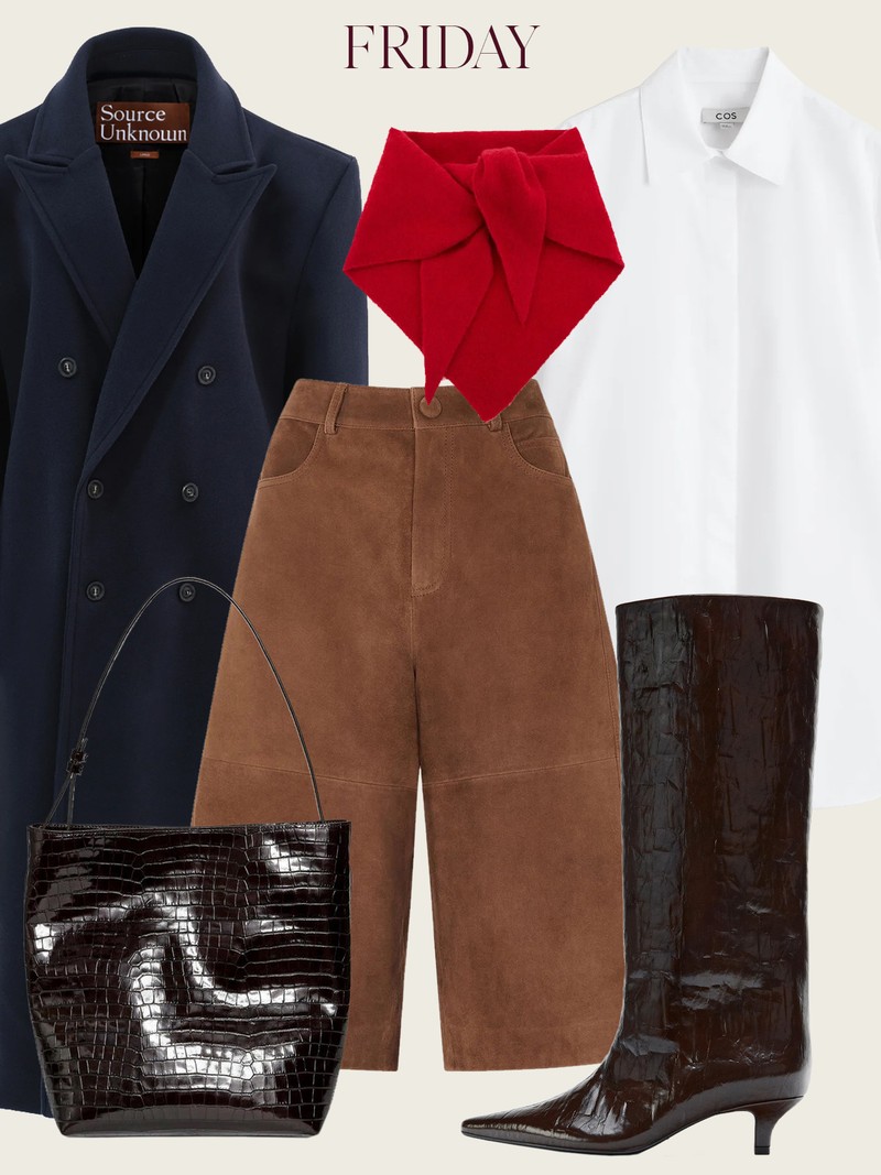 A beige pleated skirt paired with a tie-neck blouse strikes that perfect balance between softness and structure. Layer a long, belted mac over the top to sharpen the silhouette and finish with rich chocolate brown accessories.