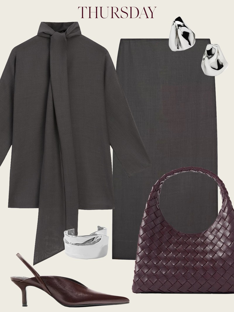 A matching set is a no-brainer. This grey pencil skirt and scarf-top combo feels smart but cool. Add sculptural silver jewellery to pull everything together.