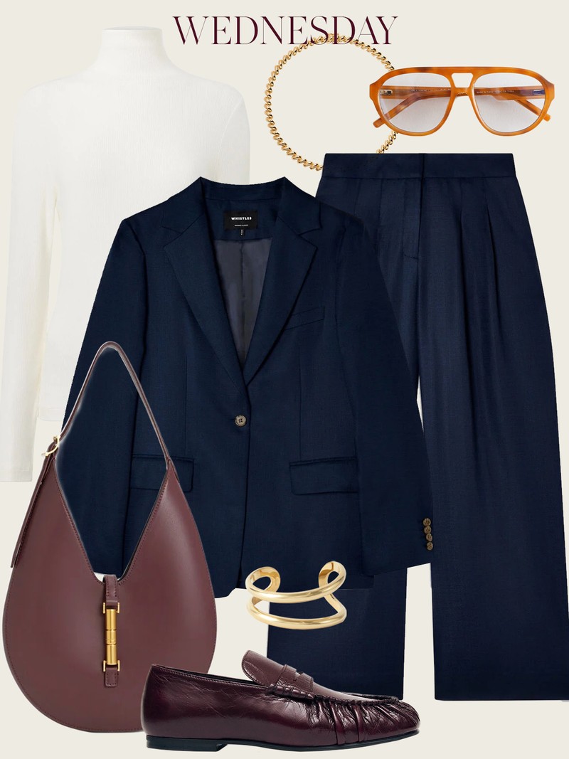 A navy suit feels instantly more directional layered over a funnel-neck top. The contrast keeps the tailoring fresh and modern – ground it with burgundy accessories for a rich hit of colour.